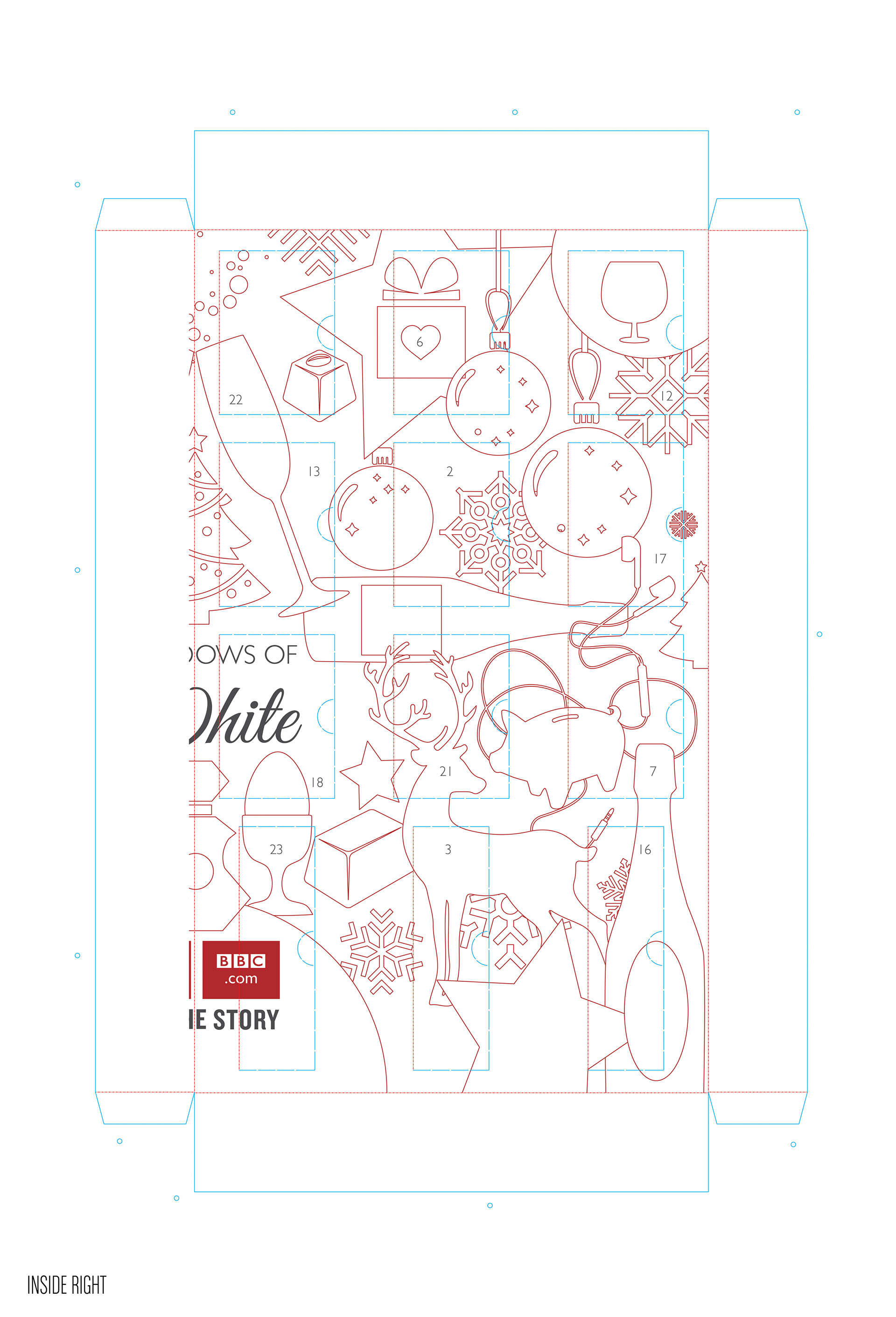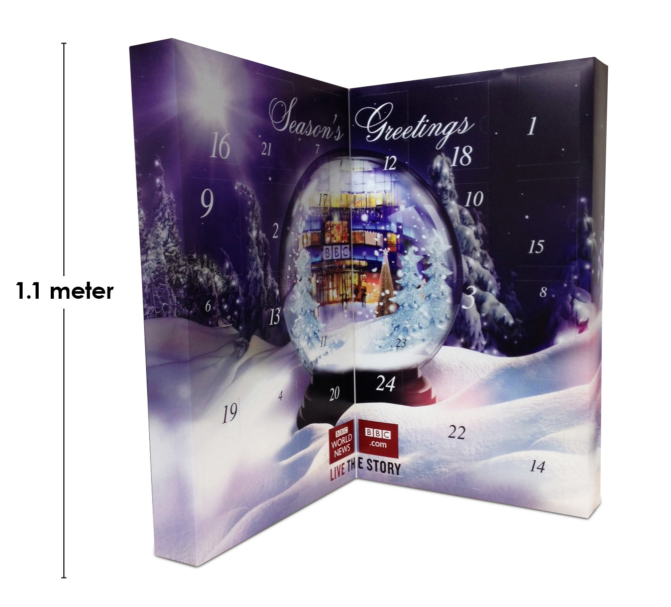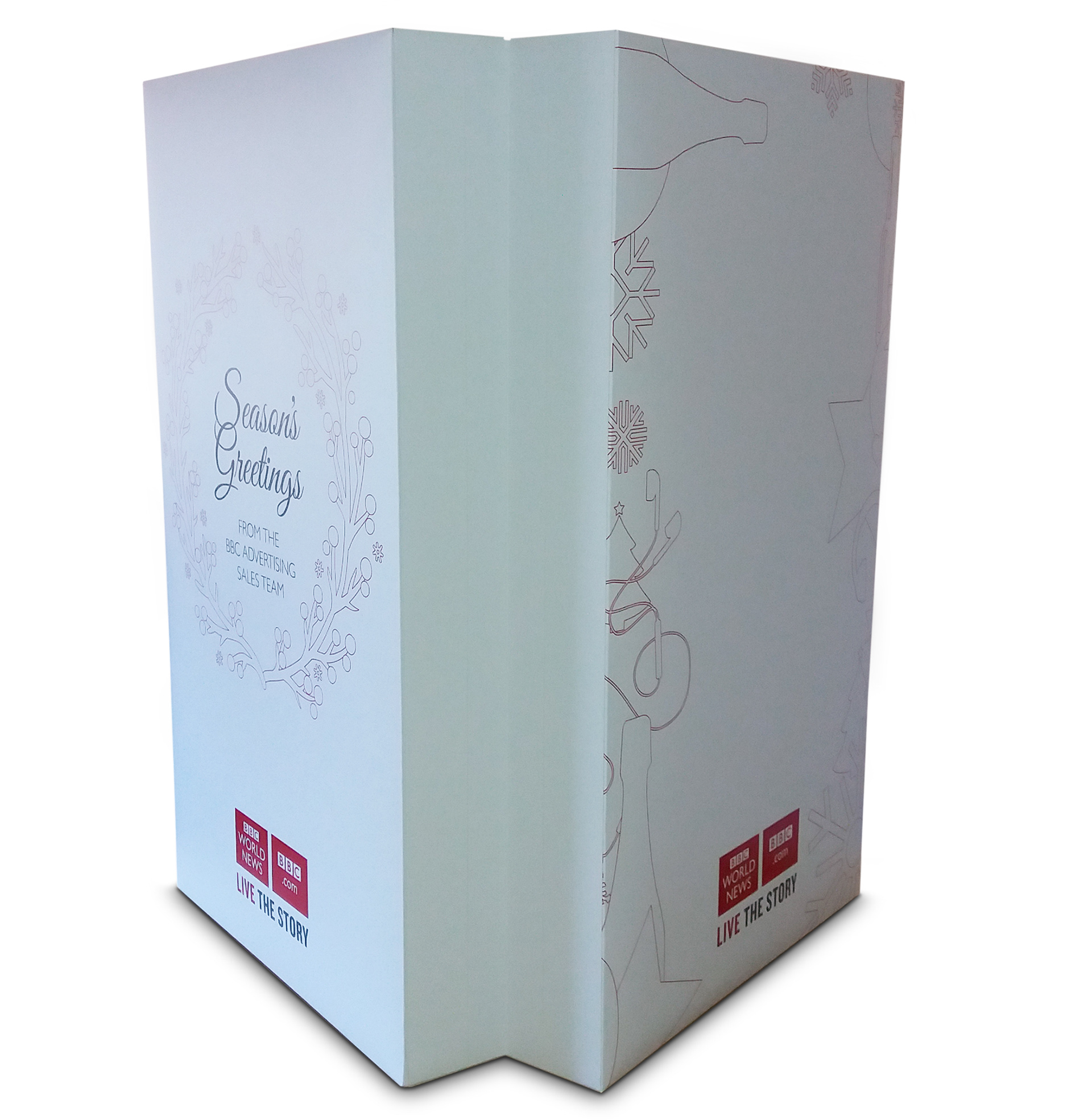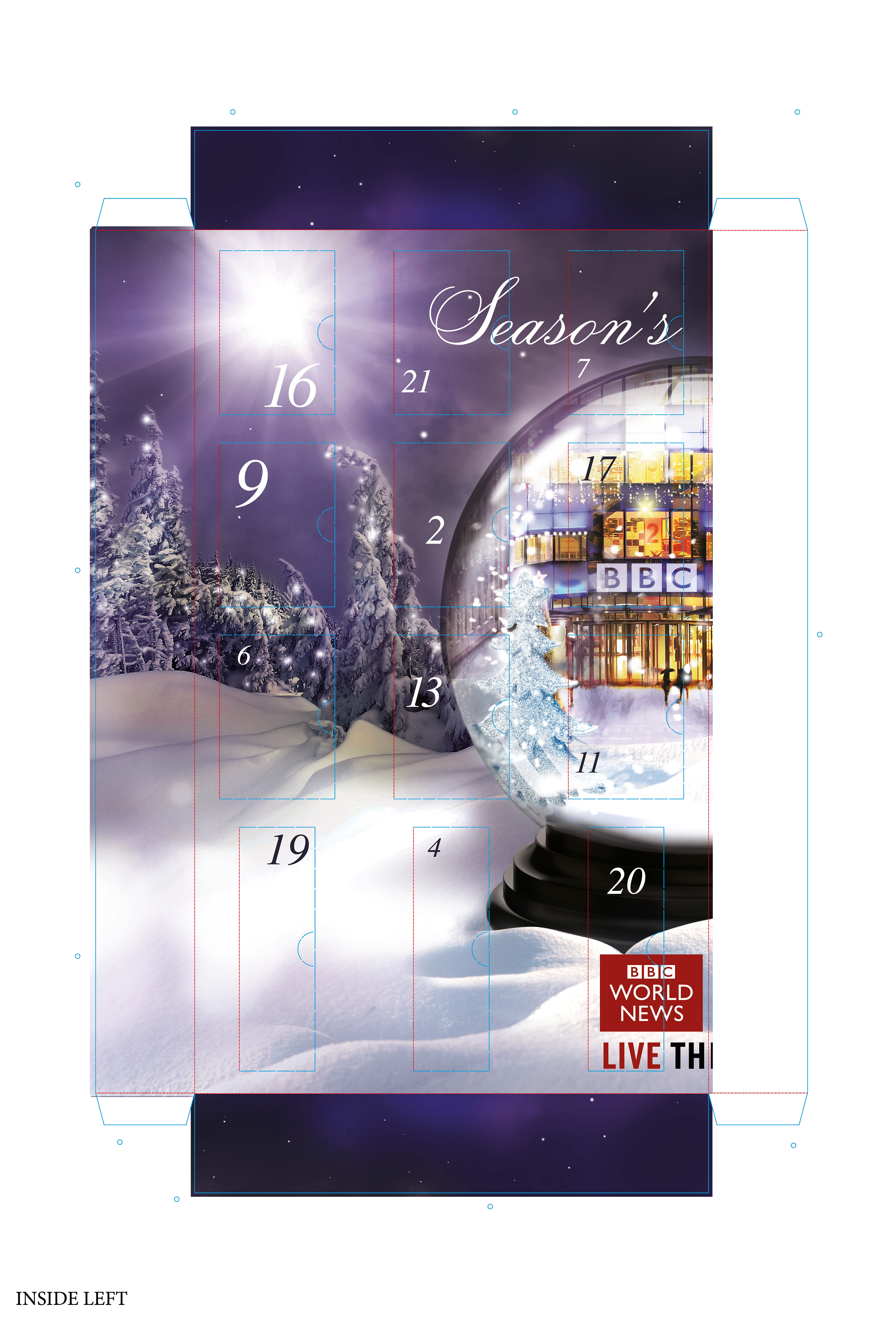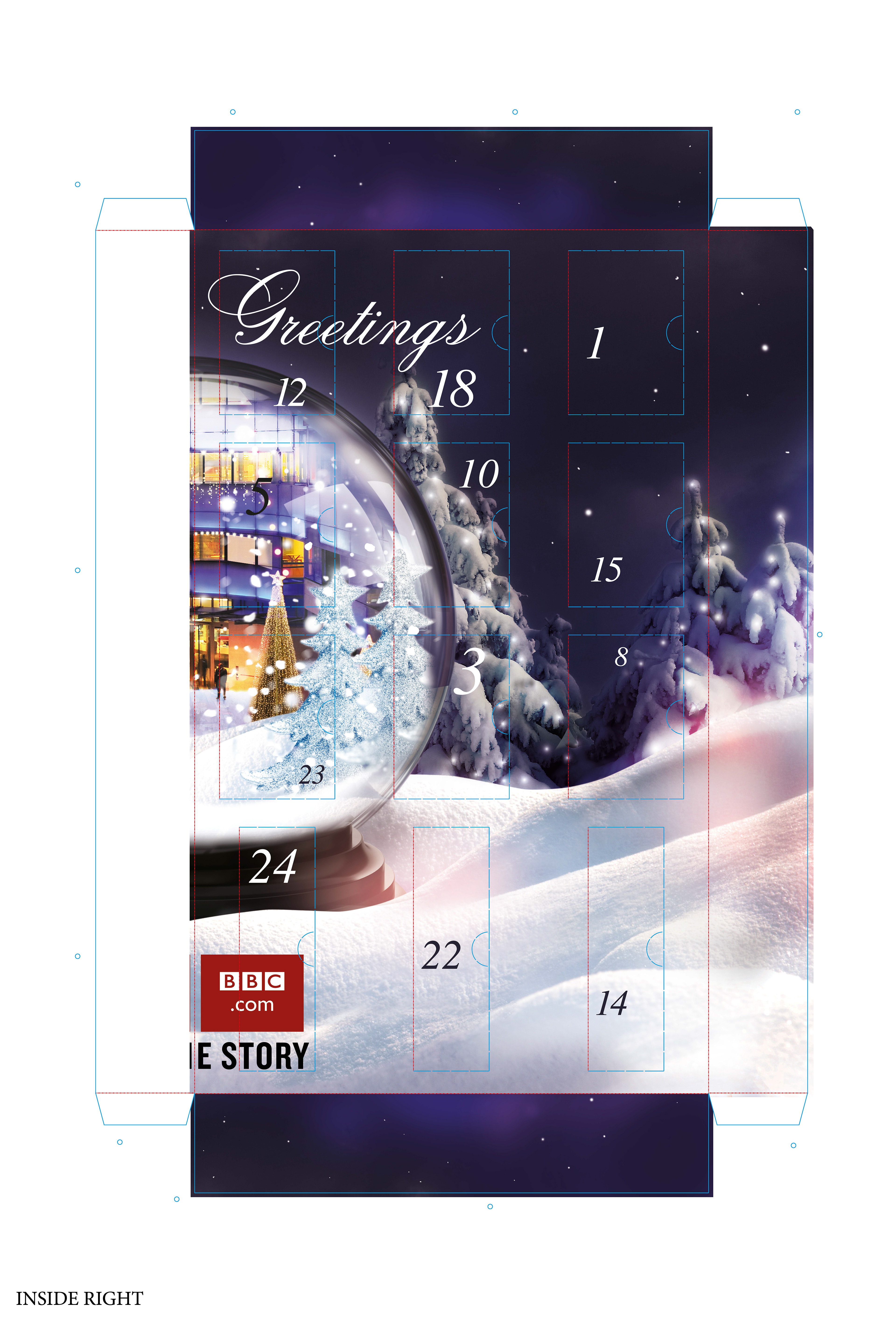 I had to create from scratch the cutter guide for this 1.1 meter advent calendar to hold a variety of gifts from wine, chocolate, gift cards, mugs and bluetooth speakers. This was a thank you from the BBC advertising sales team to its media agencies. The design was created by Karl Gilbert when we were at Lavish Creative and I did the artwork and retouching of the scene, including fitting the BBC building into the snow globe.