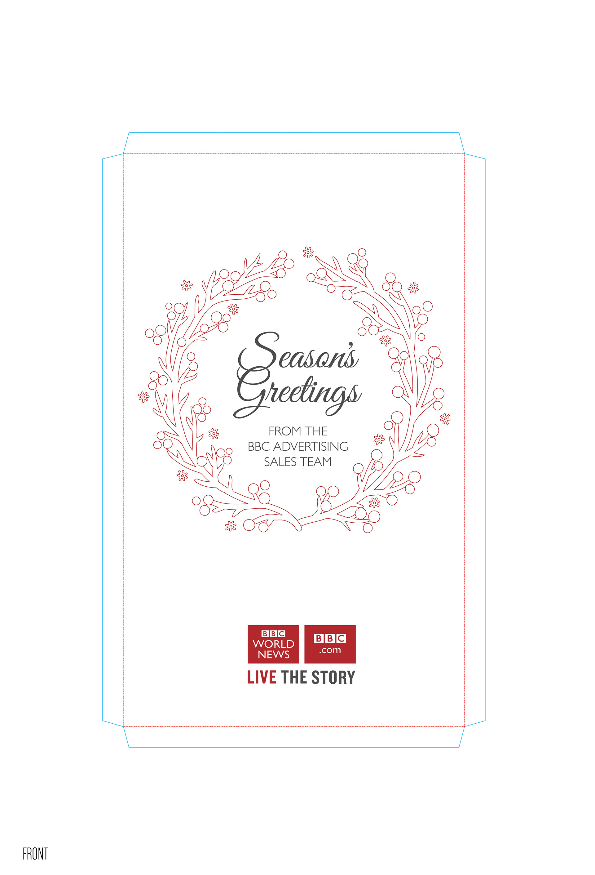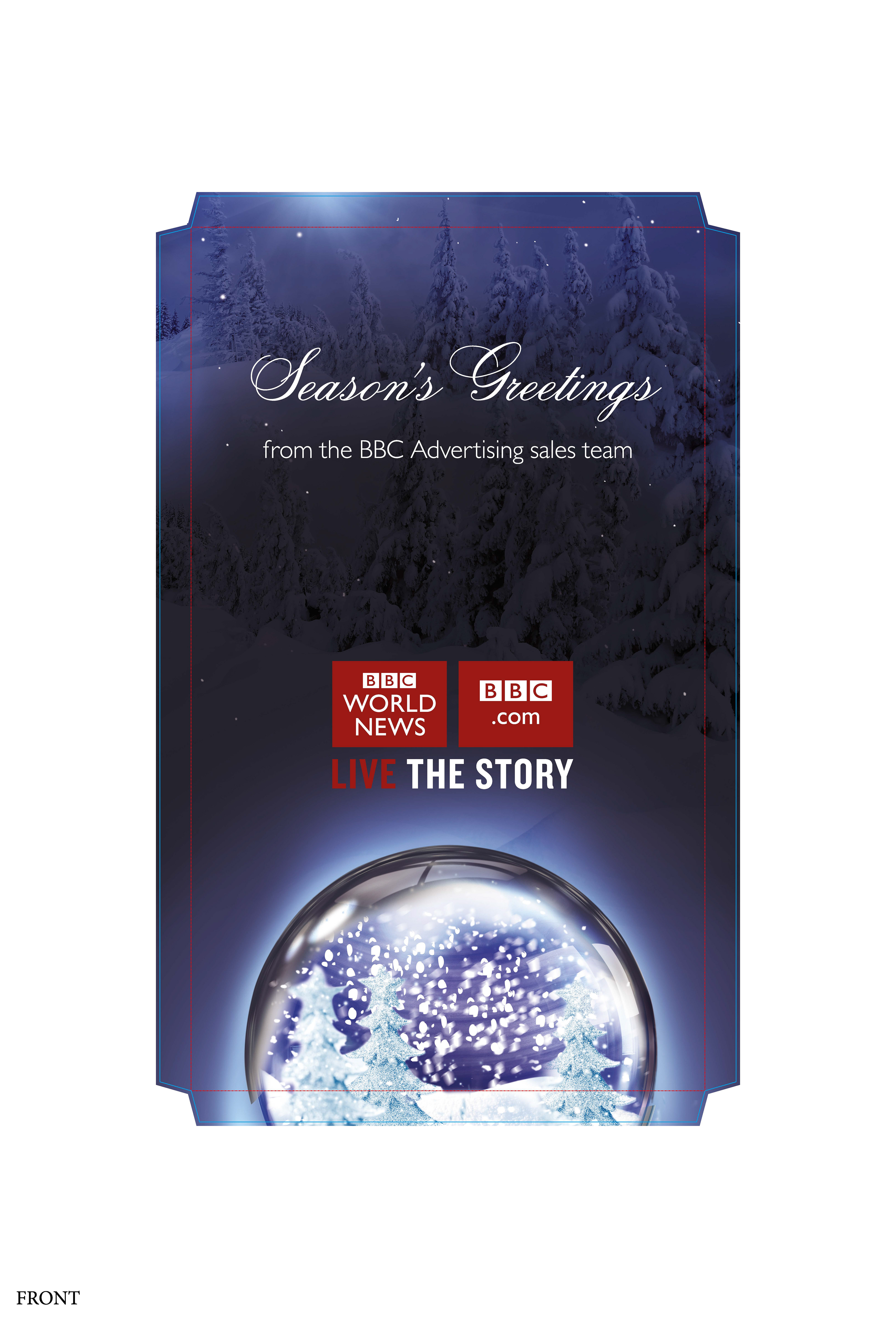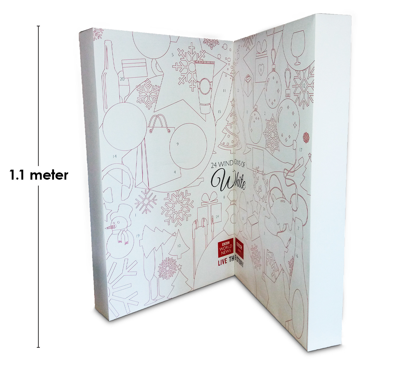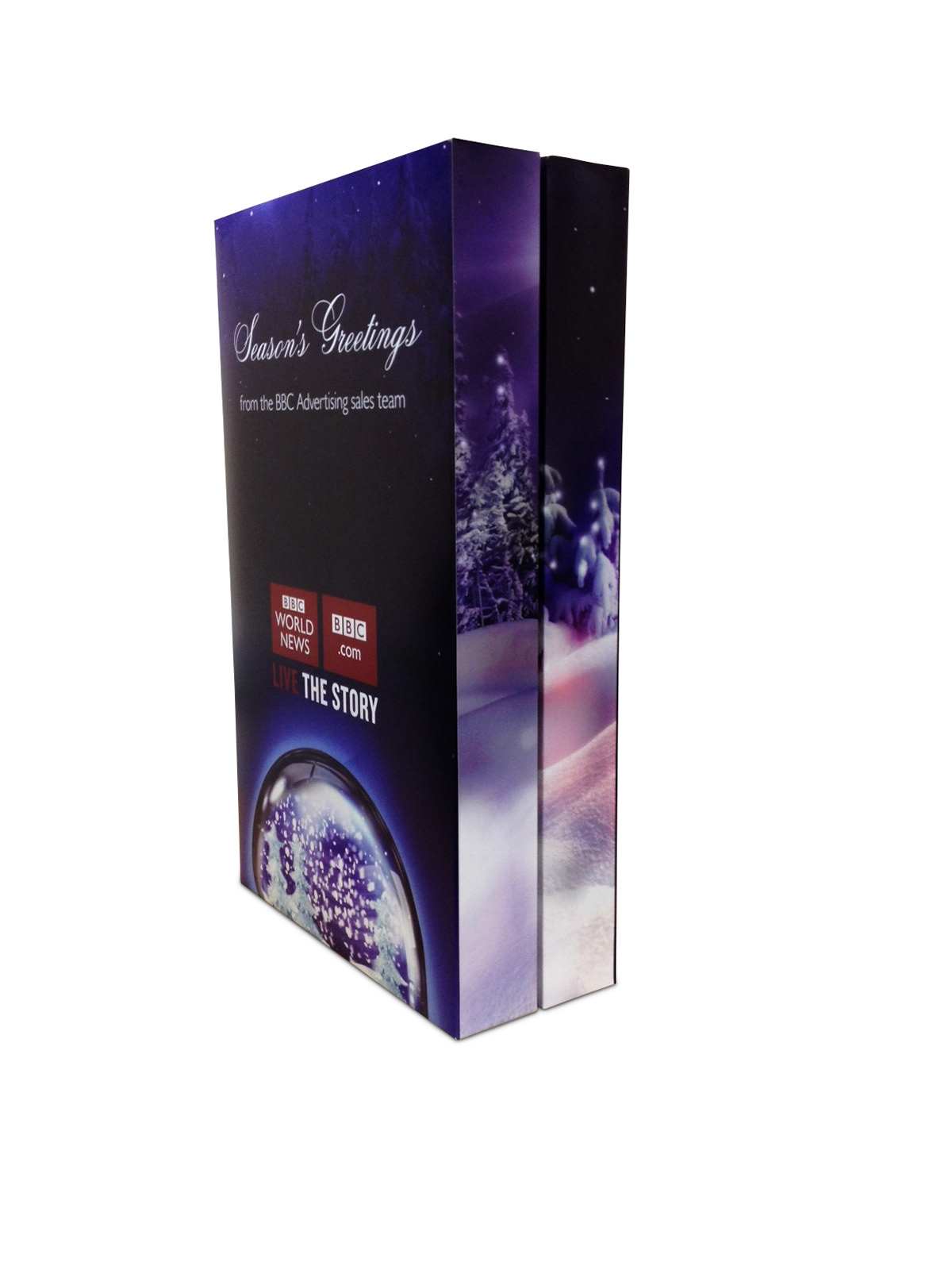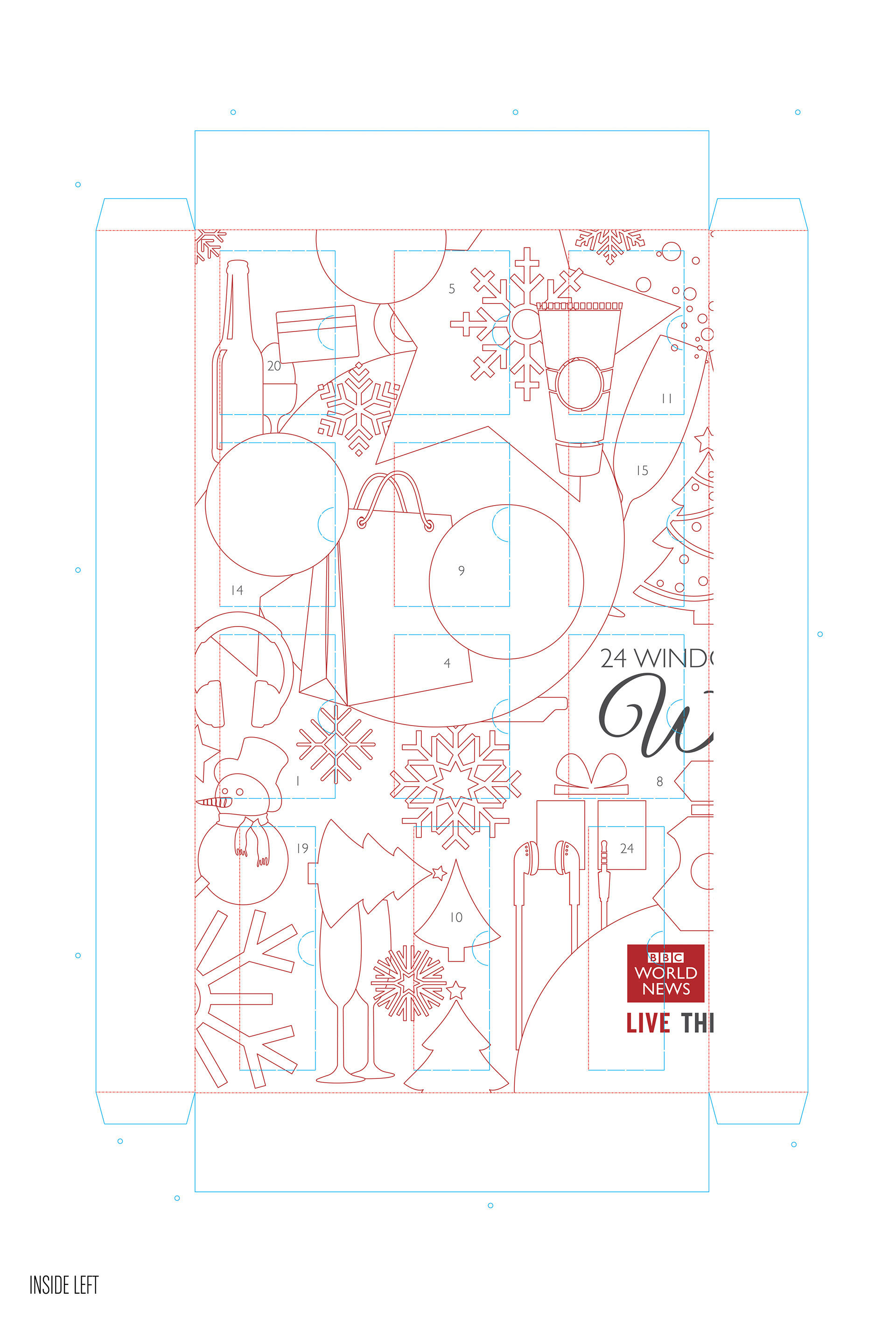 I had to create from scratch the cutter guide for this 1.1 meter advent calendar to hold a variety of gifts from wine, chocolate, gift cards, mugs and bluetooth speakers. This was a thank you from the BBC advertising sales team to its media agencies. The design was created by Karl Gilbert when we were at Lavish Creative and I did the artwork and retouching of the scene, including fitting the BBC building into the snow globe.